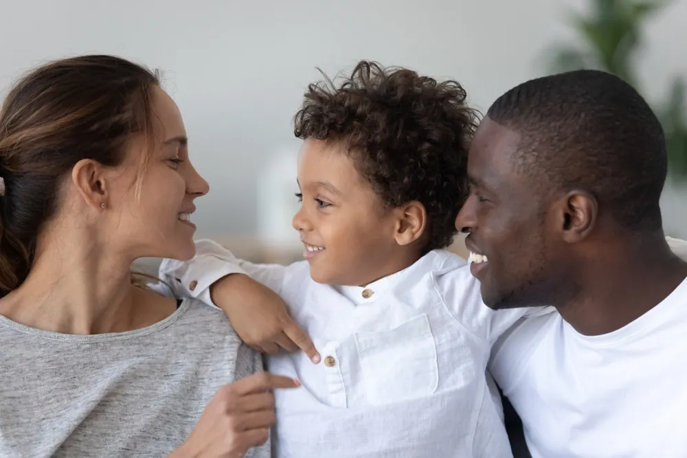 smiling young multiethnic parents hug cuddle